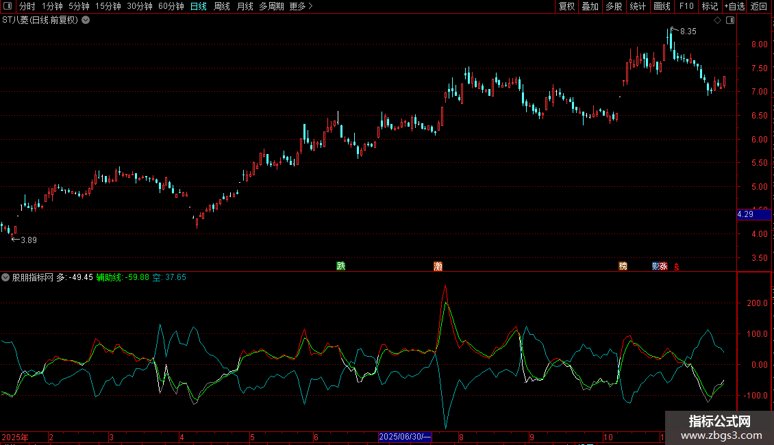 当“多”指标值小于-50时,该部分K线以灰色显示,表示极度弱势区域。