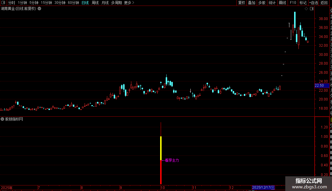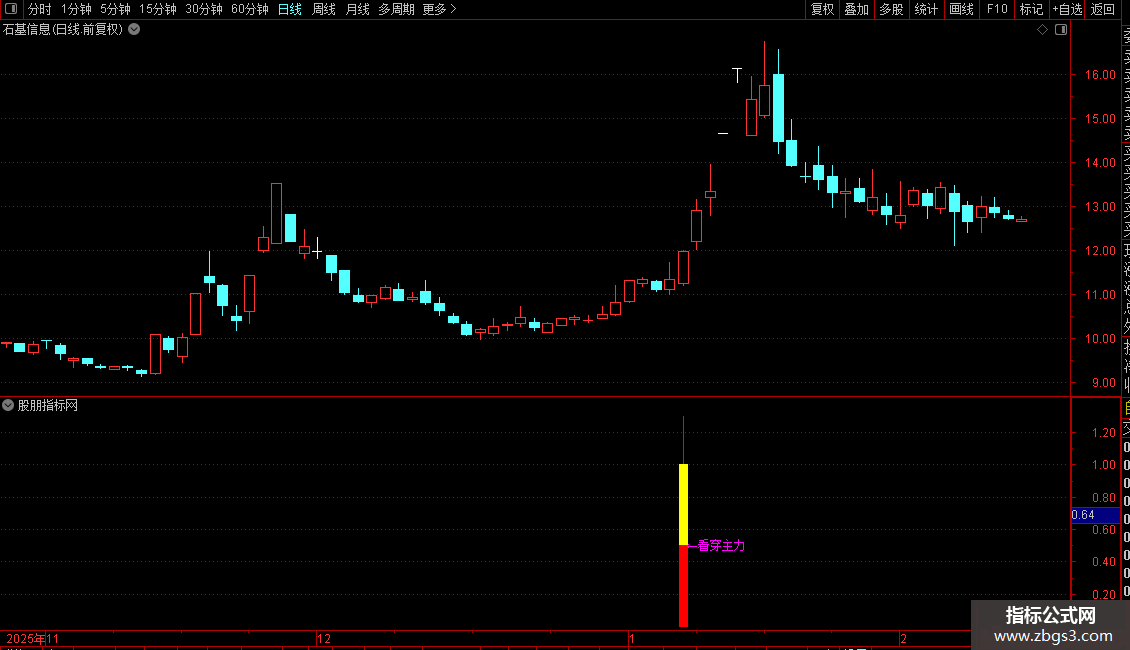指标通过分析筹码分布与价格关系,识别主力资金可能介入的时机。核心逻辑是对比当前获利盘与近期价格波动区间的筹码集中度,当股价处于短期均线上方、主力筹码优势显现且排除涨停干扰时,发出“看穿主力”信号。适用于捕捉主力吸筹初期的低风险买点。