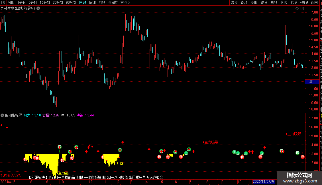 3. 辅助参考:结合机构买入/卖出占比,买入占比越高、主力差值为正,资金做多意愿越强;价格突破紫色十三周价决策线,是趋势转强的辅助验证信号。