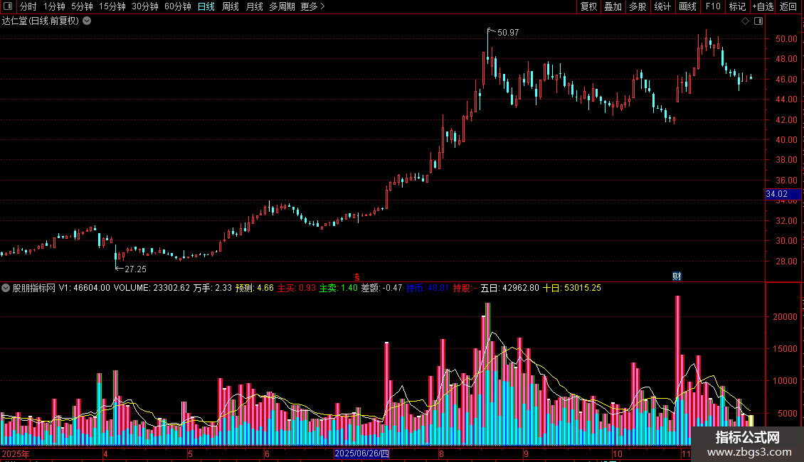 该指标在日线周期的当日K线上功能最全,会显示预测成交量及渐变柱线。