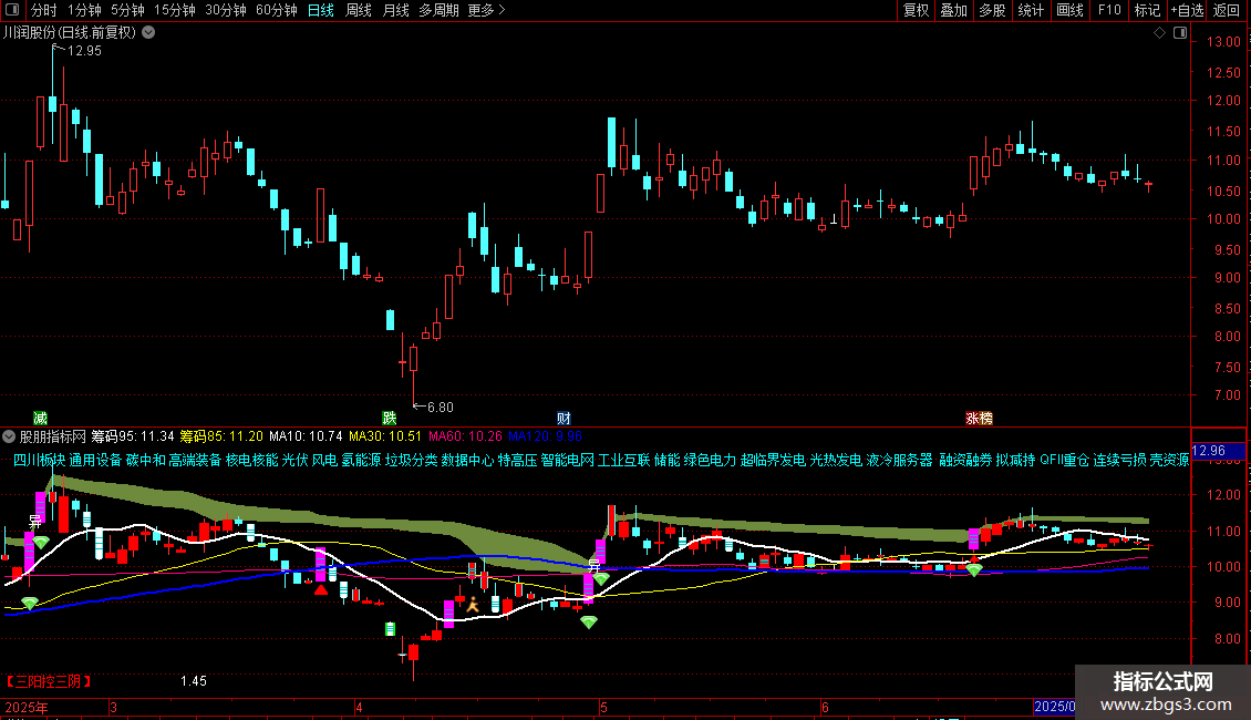 在K线图左上角显示“【三阳控三阴】”标题及前一日的“阳总量/阴总量”比值。该比值用于衡量近期买方(阳量)与卖方(阴量)的力量对比,比值越大,说明近期买方力量越占优。
