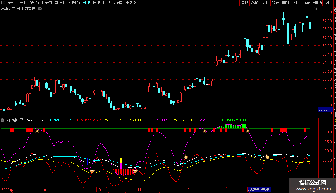 1. 区间判断:50(黄色粗线)为强弱分水岭,160(绿色粗线)为超买线。指标线(DWXD17,紫红色)上穿50出现红色图标,提示转强可逢低布局;下穿160出现绿色图标,提示超买回落,宜减仓。