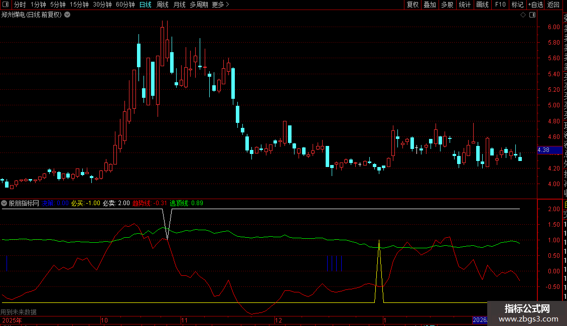 必买:使用TROUGHBARS函数寻找最近一个满足条件的波谷位置。若当前是波谷(结果为0)且最高价大于最低价加0.01,则输出1,否则输出-1。以黄色细线显示。