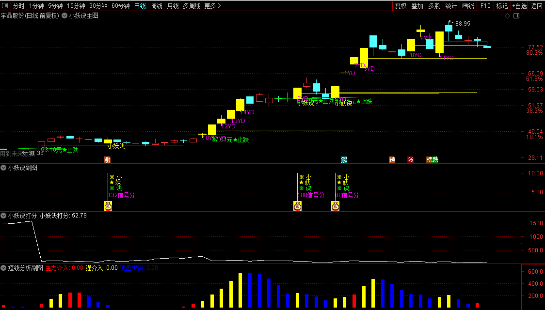 2、自动捕捉符合近期活跃个股为主,又符合强势洗盘挖坑后的启动、触发小妖诀信号提示