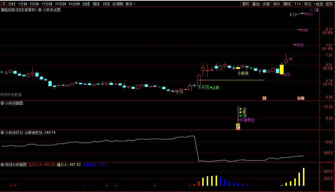1、小妖诀打分第1支:尾盘稳健操作风格、上升途中短暂控坑、打分排序第1名的介入。