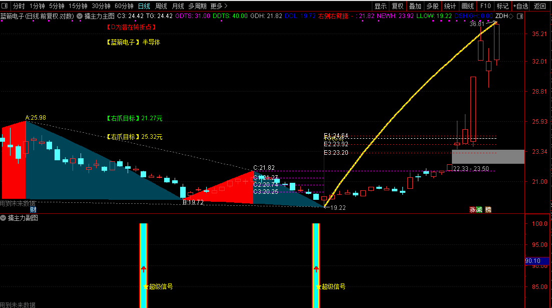 主图是一款波段分析专用工具,直接在K线图表上展示完整的价格结构。它通过复杂的算法自动识别并标注股价运行中的关键高低点序列,包括前一高、前二高、前三高以及对应的低点位置,形成清晰的多层次支撑压力网络。指标核心功能是动态计算波段目标价位和上涨空间,为交易者提供具体的价格预期。当价格接近或突破关键位置时,主图会以文字和线段形式给出明确的"波段目标"、"上涨空间"及"目标实现"等提示。通过绘制趋势线、通道和箱体结构,直观展示主力可能的控盘区域和股价运行轨迹,帮助交易者从宏观角度把握趋势结构和转折时机。