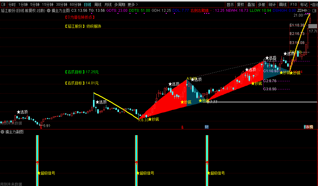 副图指标还简化了主图中的多级支撑阻力位,以曲线形式展示关键的波段目标、支撑位和阻力位,包括ED1、ED2、ED3等多个测算价位。同时,它强化了"抄底"、"逃顶"等关键信号的显示,通过图标和文本让重要信号更加突出。