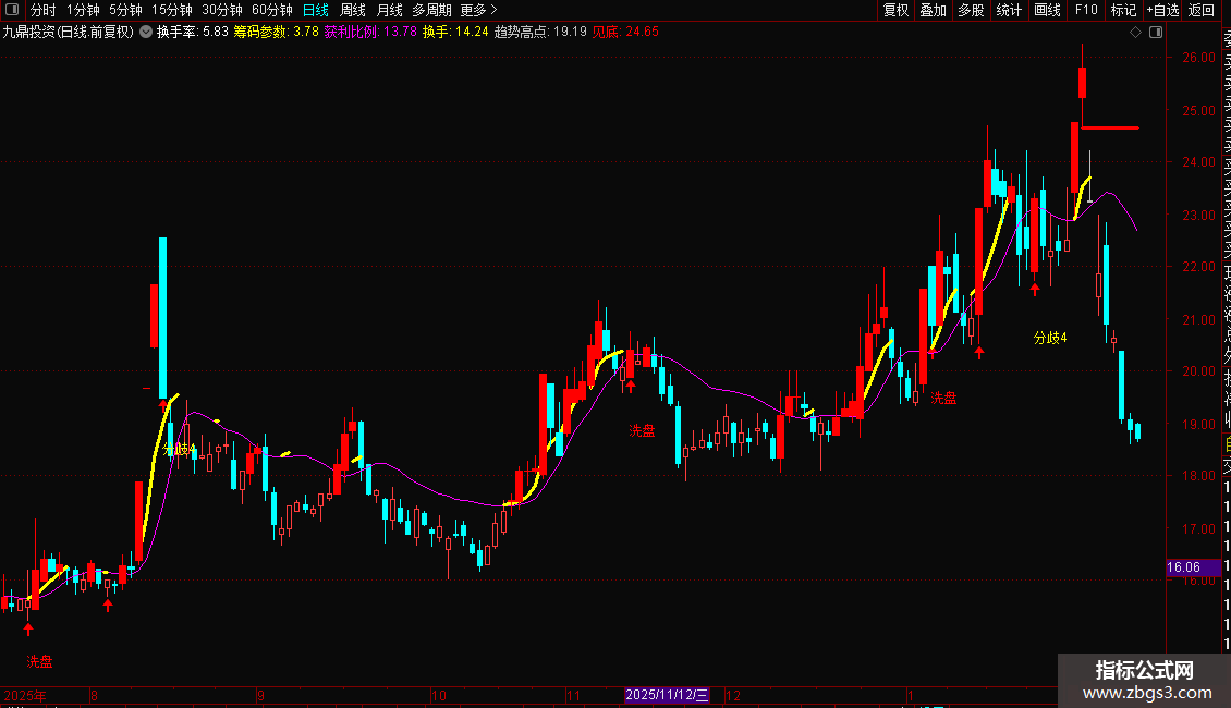 3. 趋势参考:黄色粗线【黄金线】为强势生命线,股价站在线上为多头趋势,线上红/青色K线为趋势延续;