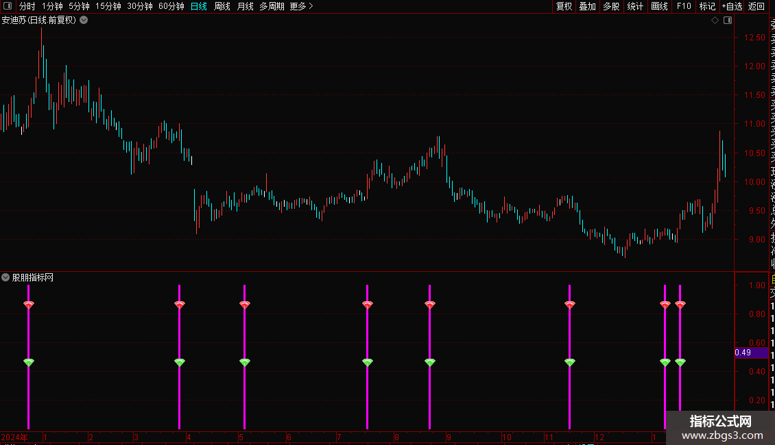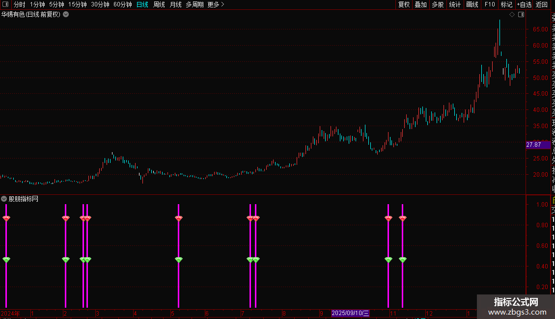 将公式加载到个股K线副图,当出现**紫色柱体+双钻石图标**时,为明确买入信号,信号同步匹配结果,可直观验证个股量价与指标共振有效性。