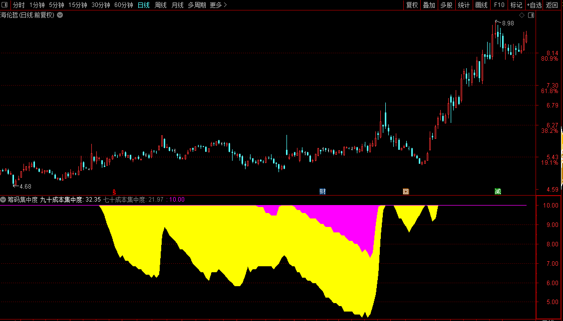 上面的指标中,我统计了70%的筹码集中度和90%的筹码集中度,两个数值都是小于10进行标记,70%小于10画黄色带,90%小于10画紫色带。