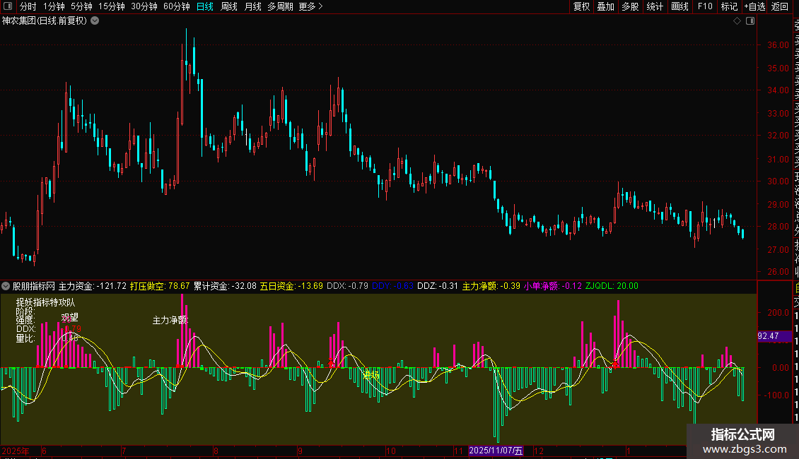 1. 阶段判断:公式左上角直接标注“吸筹/洗盘/拉升/出货/观望”,直观识别主力当前动向;