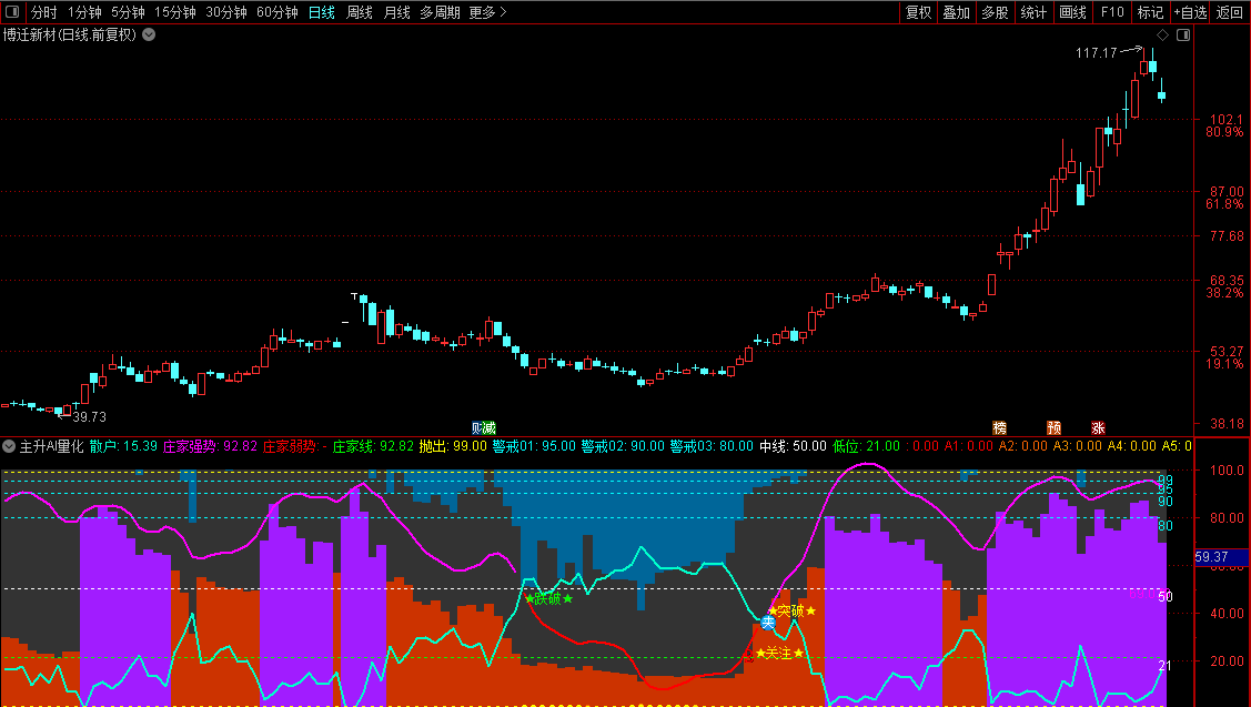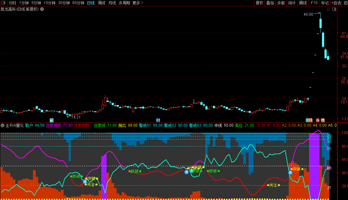 信号捕捉:出现黄色“★突破★”信号时,代表庄家线上穿散户线,为关注信号;若出现“跌破”信号,则需警惕回调风险,考虑离场。