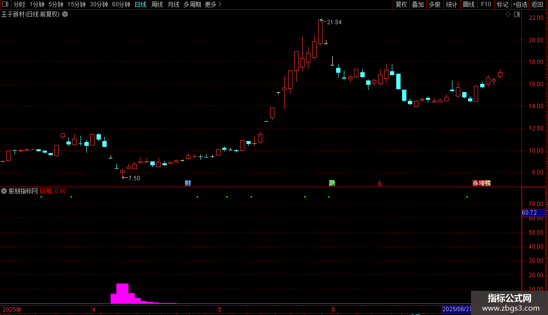 “主力跟踪”柱状图(洋红色):是“吸筹”线的柱状表现形式,更直观地显示吸筹力度的变化。柱体出现并升高,表示主力吸筹行为活跃。