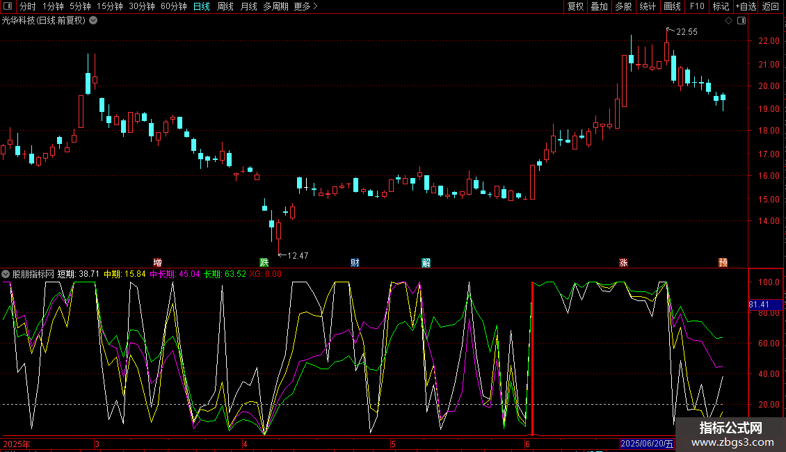 - 中长期:基于4N周期(默认20日)计算威廉超卖值,用洋红色线显示。