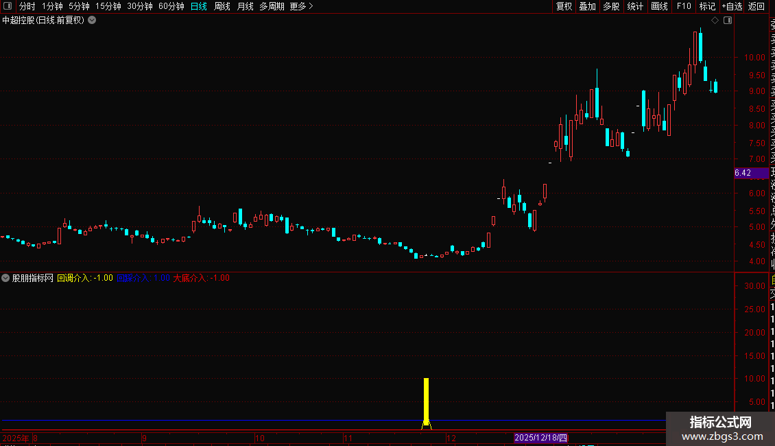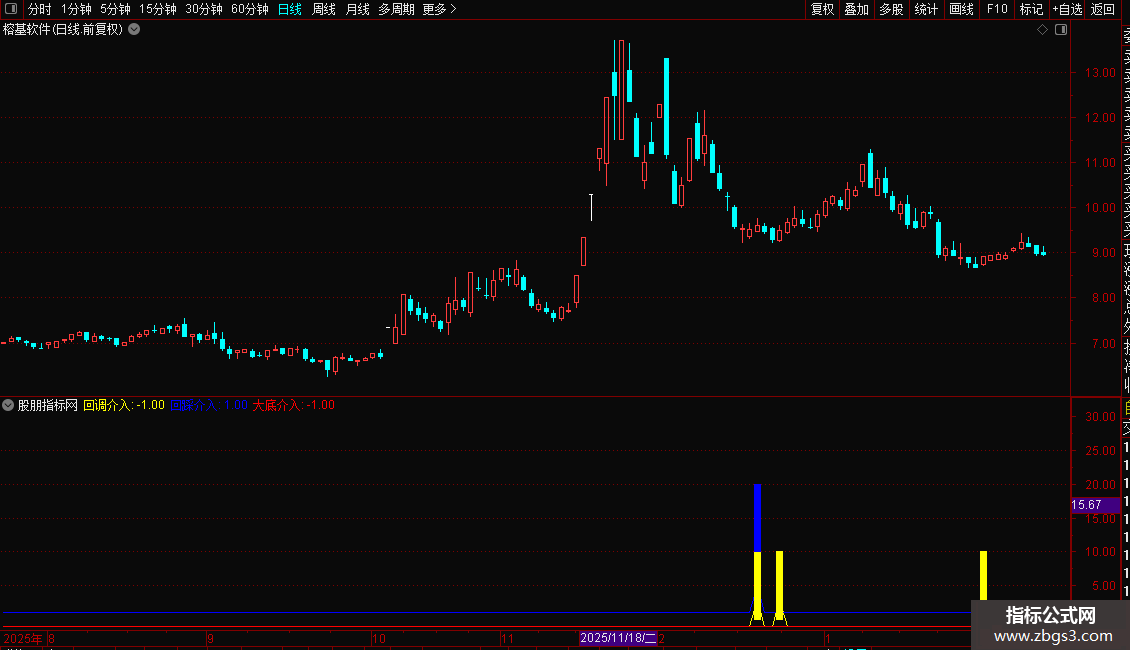 1. 副图公式:导入通达信副图指标,图表中黄色柱=回调介入、蓝色柱=回踩介入、红色柱=大底介入,直观显示当日信号;