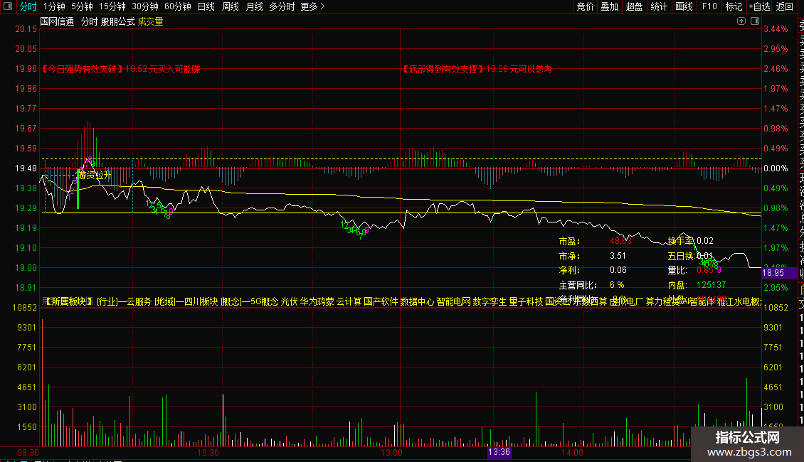 上穿分时:IF(((SETCODE< 2) AND (CONST(MZ0)< 241)),CONST(IF((TIME< 1000),HHV(CLOSE,0),SUM((IF((TIME=1000),1,0)*HHV(CLOSE,0)),0))),DRAWNULL)LINETHICK1,DOTLINE,COLOR00FFFF;