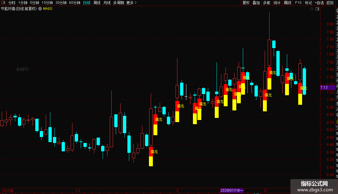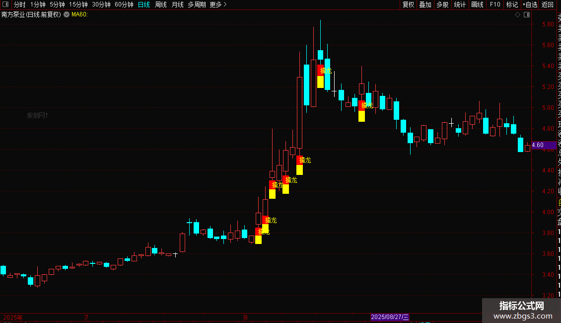 2. 核心信号为红黄柱线+“擒龙”文字标注,是短线买入关键参考;