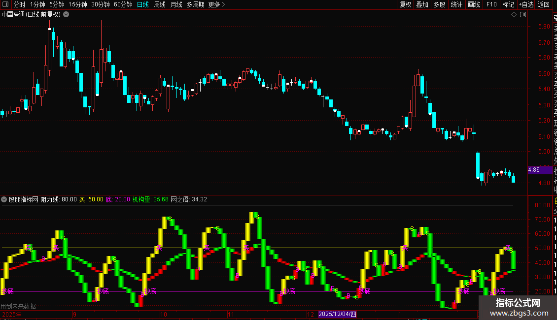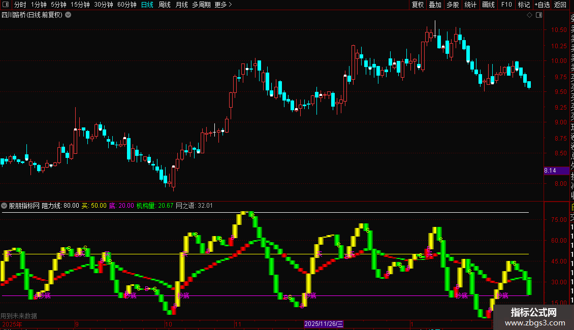 2. 参考线:提供阻力位(80)、买入参考位(50)和底部参考位(20)。