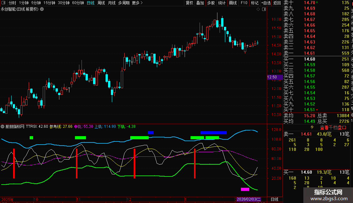 这是一个基于RSI原理的多维动量指标,名为TTRSI。它综合了收盘价、最高价、最低价、开盘价相对于其短期均线的强度,并加入了与大盘指数的关联度分析。