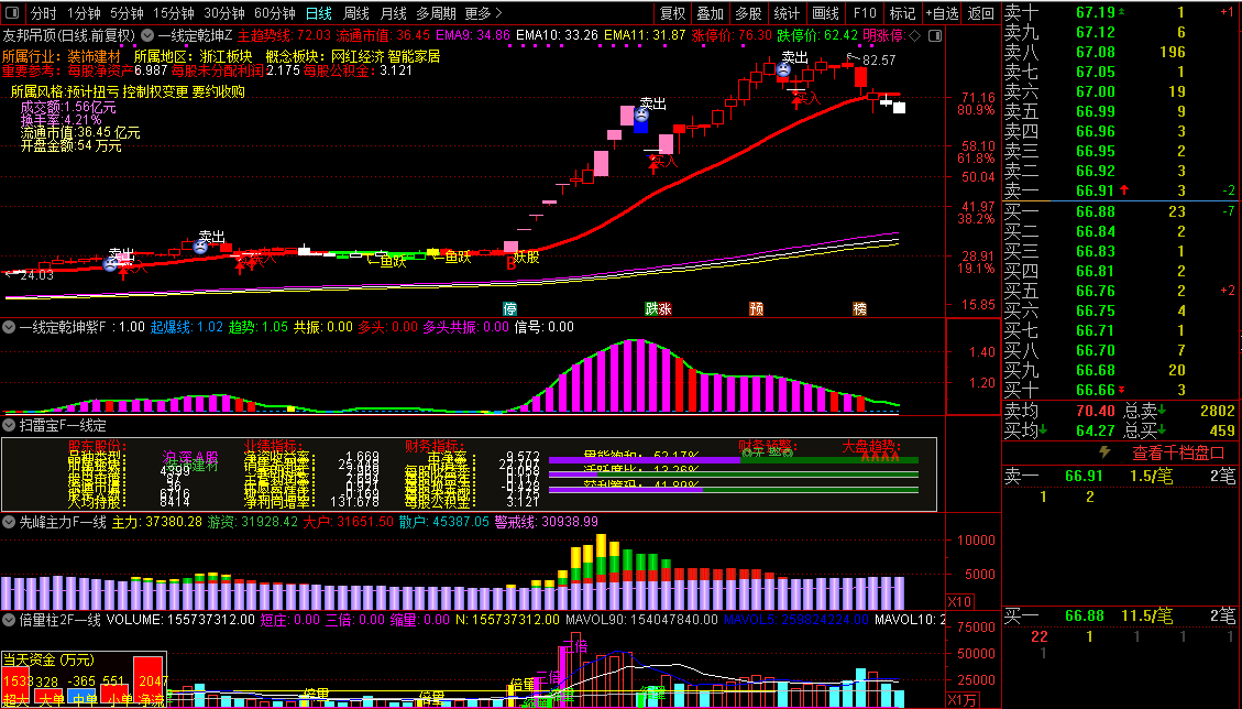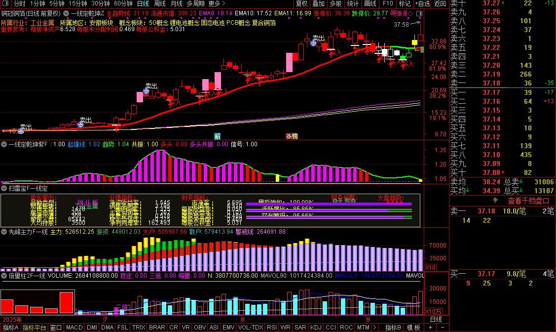 先峰主力F一线副图是资金流向分层柱状图,把成交额处理成四条不同周期的均线,代表四类资金:黄色主力(4日)、浅绿游资(8日)、红色大户(16日)、浅蓝散户(32日),粉色警戒线(180日)是长期资金成本线。柱子高度代表资金活跃度,颜色渐变只是美化。用法很简单:黄色柱(主力)高高在上、粉色警戒线稳步向上,说明大资金进场;如果蓝色柱(散户)窜高、黄色柱趴着,说明散户自嗨、难有行情。各条线多头排列(黄>绿>红>蓝)是强势区,反之是弱势区。一眼扫过去谁最高,就知道现在谁在主导这只票。