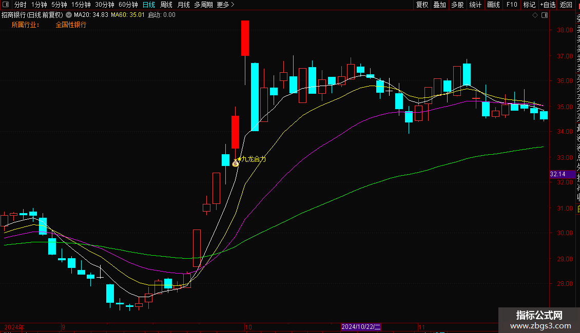 指标主要功能是监控主力资金动向与筹码集中度,识别个股所属板块,并捕捉主力吸筹结束后的爆发点。它通过计算平均成本与市场筹码分布,判断主力是否完成低位建仓。操作策略为:当出现“九天腾龙”或“九龙合力”信号,且伴随放量阳线突破时,视为强力买入时机;红色柱体代表主力积极持仓可跟进,需结合行业板块热点操作。