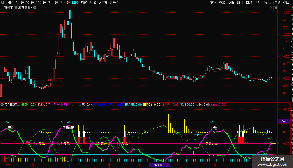 1. 趋势与机构线:通过“趋势”和“机构”两条曲线,判断市场多空力量对比。其金叉(机构上穿趋势)被标记为“铁树开花”,是重要关注信号。