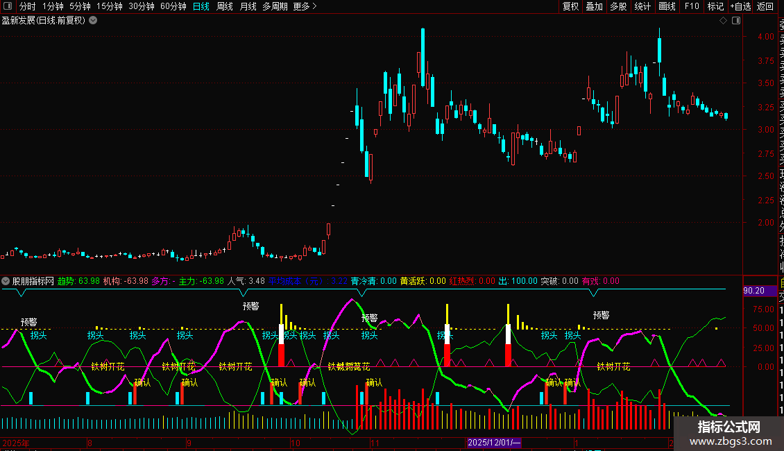 指标将价格、成交量、资金成本、市场情绪及多种技术形态信号集成于一体。使用者可主要观察“趋势”与“机构”线的相互关系,结合“铁树开花”、“突破”等文字和图形信号寻找交易时机,同时参考“人气”和“平均成本”来评估市场氛围和支撑压力位。各类彩色柱状图和“拐头”、“预警”等提示用于辅助决策和风险控制。