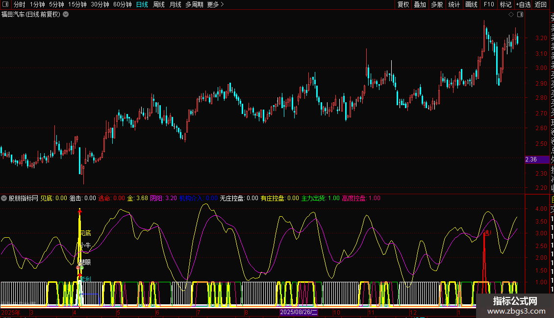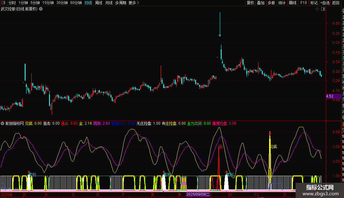 指标将多种信号(如见底、买入、卖出、资金状态)集成在一个副图窗口中显示。