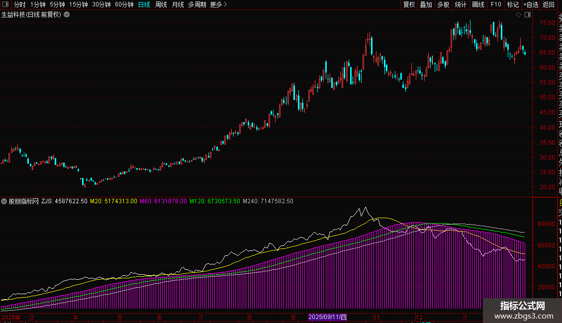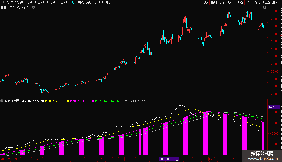 指标通过计算日内分时数据,分析资金流向。核心是“主净入”,由主买与主卖差值求得,代表资金净流入。ZJS为当日累计净流入值。后续均线(M20、M60、M120、M240)用于平滑ZJS,形成多周期趋势线,辅助判断资金流向的短期与长期态势。