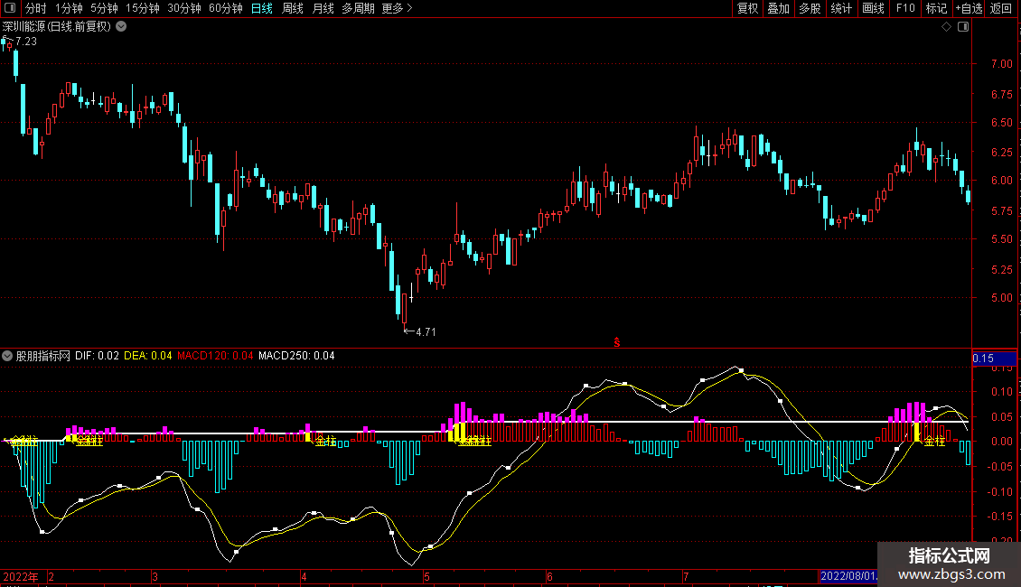 STICKLINE(MACD>=MACD250,MACD250,MACD,2,0),COLORMAGENTA;
