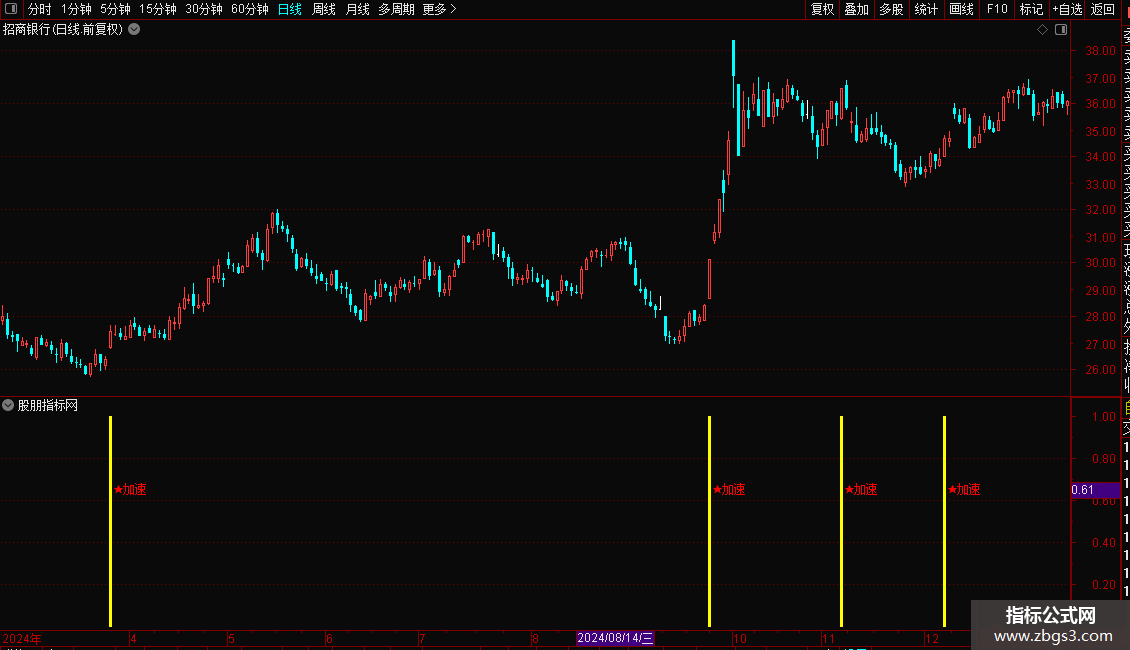 当指标在K线图上出现洋红色的柱状线并伴有“★加速”的文字提示时,表明股价已进入强势拉升区,是激进型投资者的介入良机。建议结合当时的市场热点与成交量变化进行确认,若出现信号时伴随成交量显著放大,则信号可靠性更高。稳健型投资者可等待股价回踩关键均线支撑位不破后再行加仓。止损位可设置在信号出现当日的最低价或关键均线之下。