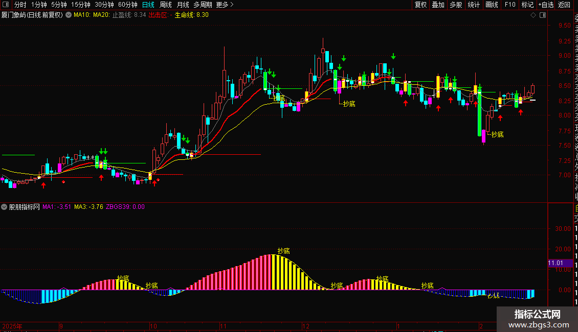 副图以主力动向为核心,结合多层EMA平滑处理,用彩色柱状图直观呈现资金流入流出节奏,并在关键拐点提示“抄底”信号;
