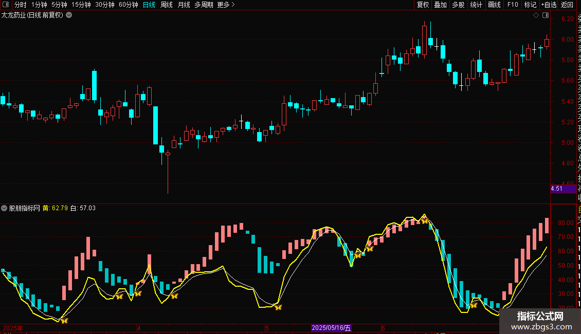 3. 使用“黄线”和“白线”表示趋势强度与平滑信号,金叉时标记图标提示。