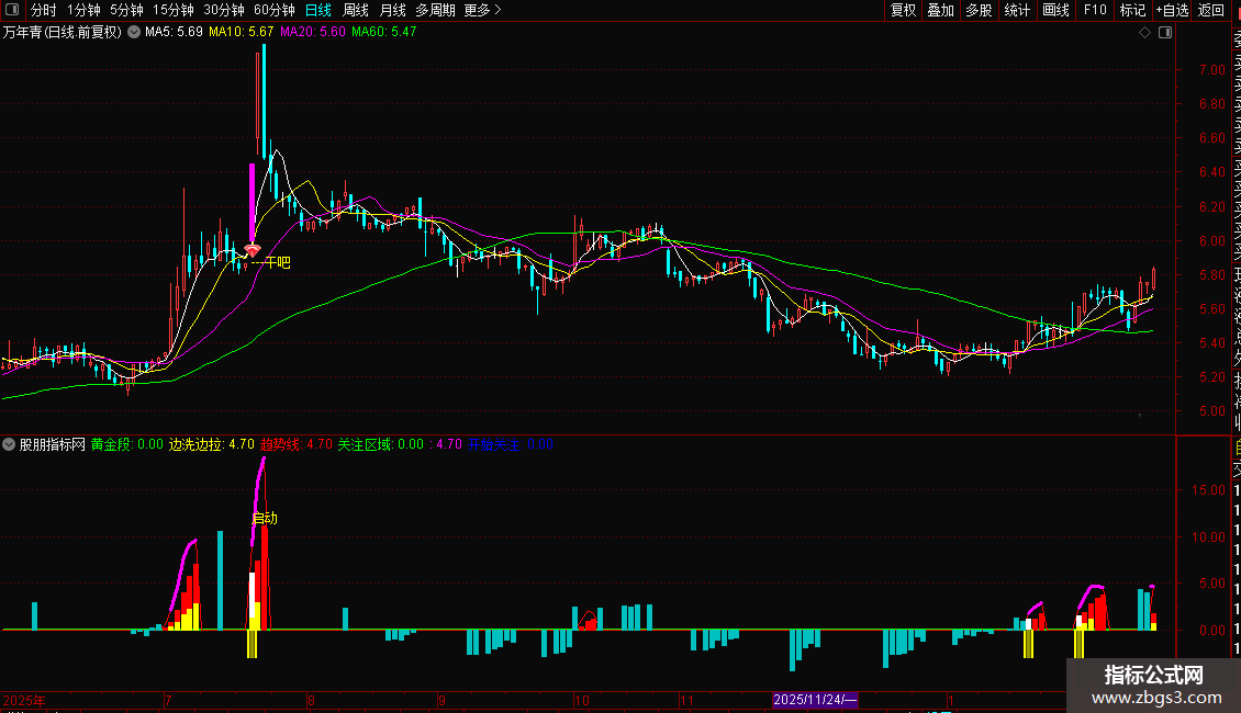 主力1:=(V > 0 AND 边洗边拉 > 0 AND A2 > REF(A2,1)) * EMA(边洗边拉,5),COLOR005999;