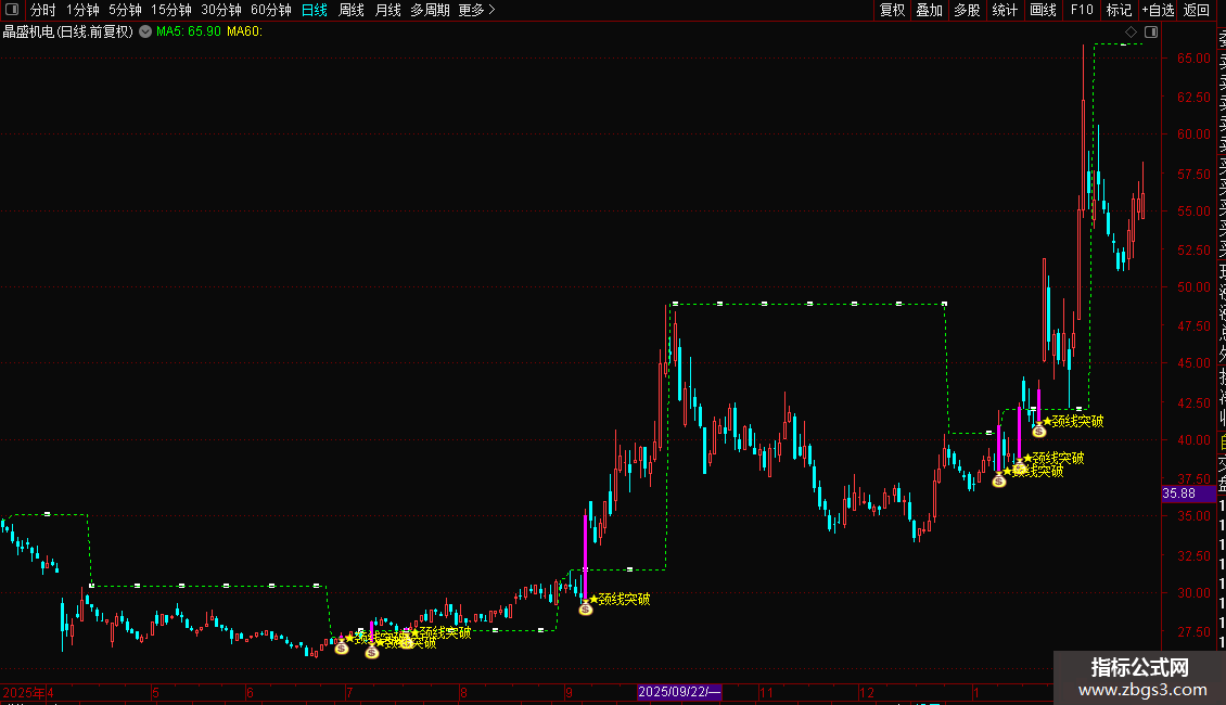 它结合成交量与价格条件,在突破时标记紫色K线和黄色文字提示,并以绿色虚线显示颈线位置。