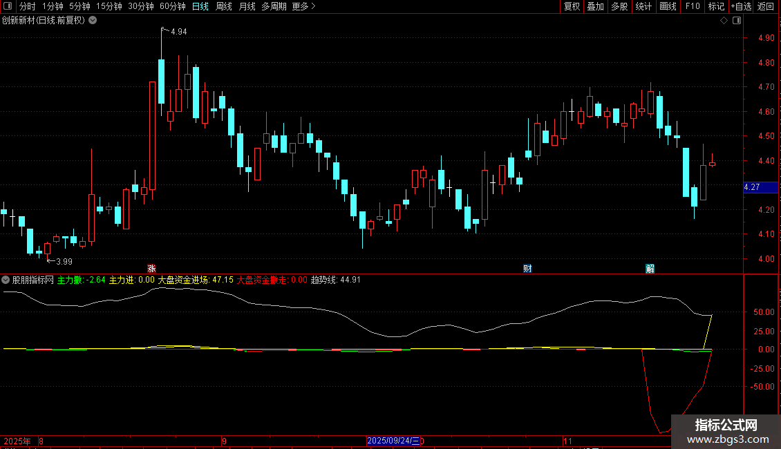 1. 主力资金监控:通过“主力进”(红色)和“主力撤”(绿色)柱状线,直观显示个股主力资金的流入与流出状态。柱线向上表示流入,向下表示流出。