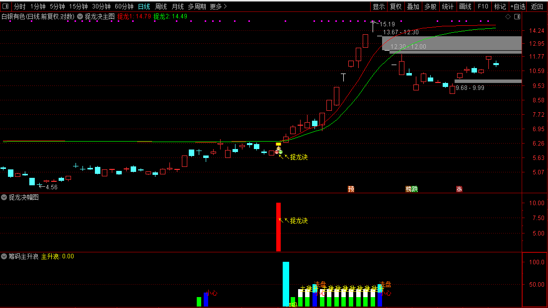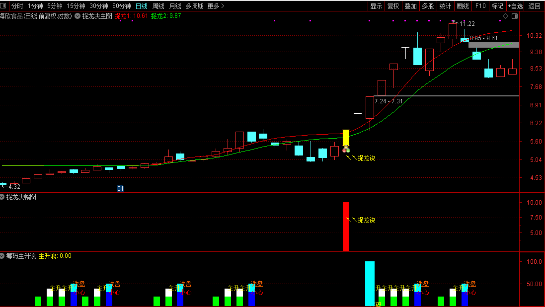 信号确认:当主图出现红色柱状标记及“捉龙诀”文字提示时,视为明确买入信号。