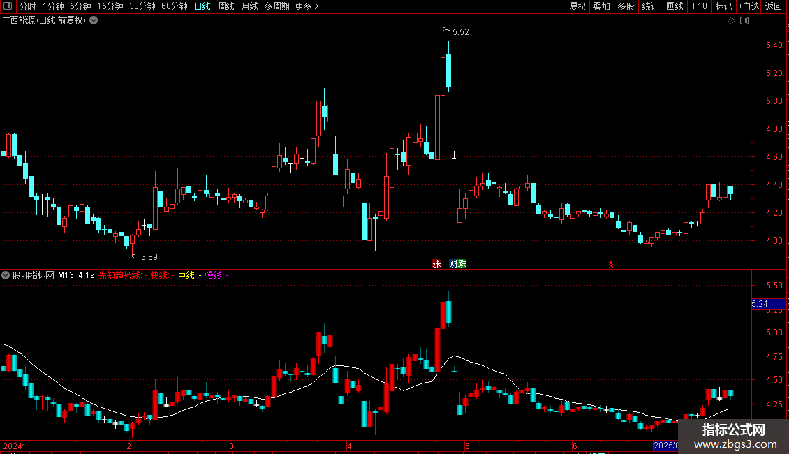 2. 多空趋势线:提供“先知趋势线”(34日均线)以及由快线、中线、慢线构成的一组短期趋势线,用于判断价格的中短期趋势方向。