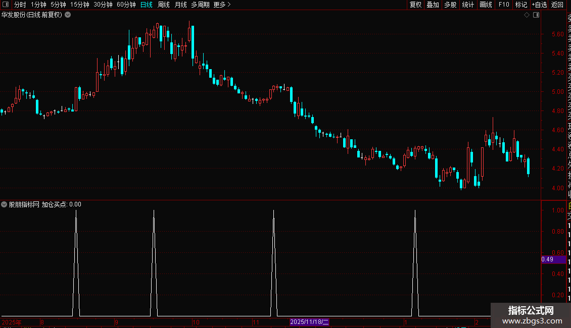 VAR1:=(CLOSE-LLV(LOW,9))/(HHV(HIGH,9)-LLV(LOW,9))*100;VAR2:=SMA(VAR1,3,1);VAR3:=SMA(VAR2,3,1);VAR4:=3*VAR2-2*VAR3;紫色柱子:=VAR4>95;VAR11:=BARSLASTCOUNT(紫色柱子)=1;加仓买点:VAR11;