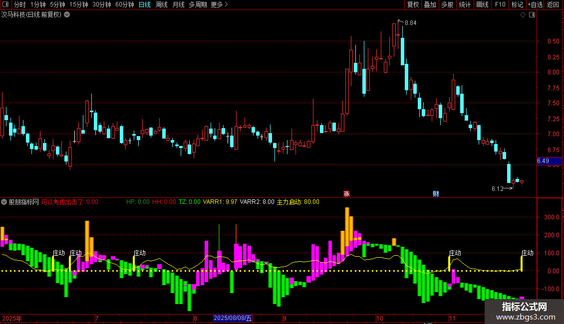 6. 主力启动信号:通过VARR1(一个快速摆动指标)上穿阈值线VARR2来提示短期资金进场或启动迹象,并标注“庄动”文字。