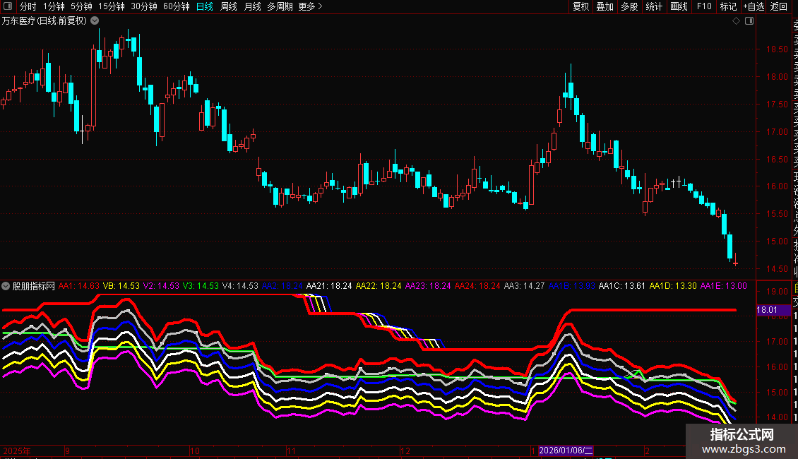 AA1:(2*CLOSE+HIGH+LOW)/4,COLORRED,LINETHICK4; VB:LLV(LOW,21),LINETHICK1;V2:LLV(LOW,20),LINETHICK1;V3:LLV(LOW,19),LINETHICK3;V4:LLV(LOW,18),LINETHICK1;