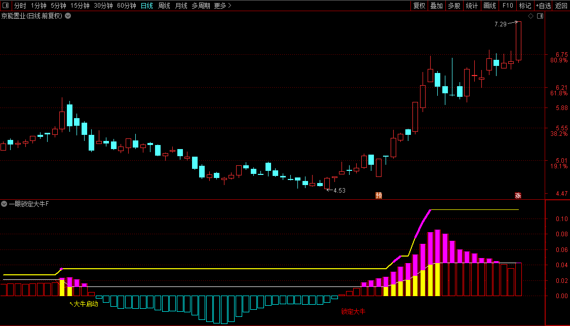 指标融合了价格波动监测与多周期能量分析,其核心逻辑在于通过识别股价在特定周期内的关键价位突破,并结合日、周、月、季四重周期的MACD能量柱,对个股的强势阶段进行立体化筛选。