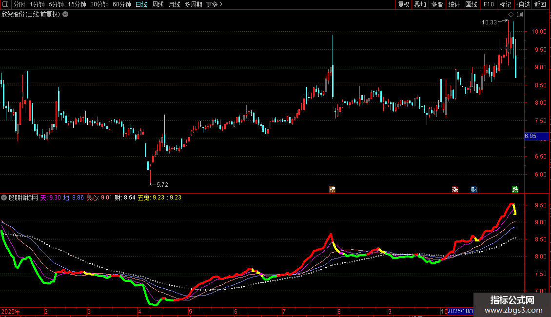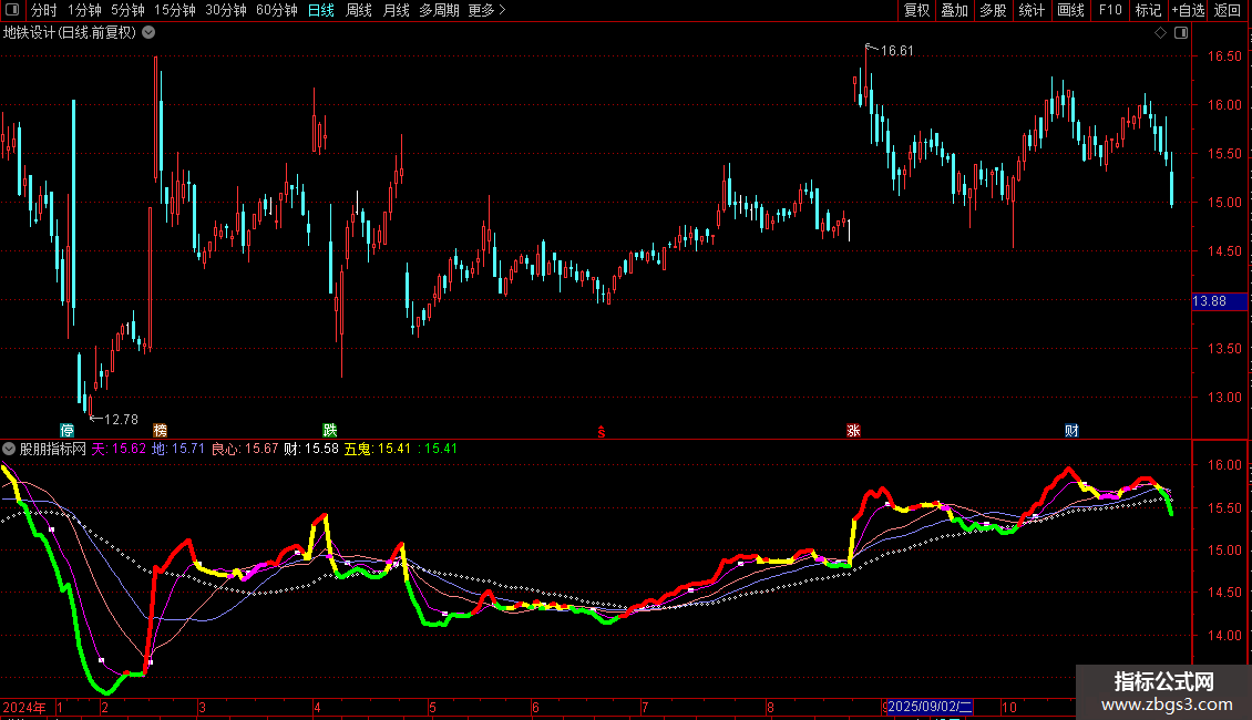 指标通过计算不同周期的移动平均线组合,构建了“天、地、良心、财、五鬼”五条核心均线。其核心逻辑是依据“五鬼”线相对于其他均线的位置关系,以及P1与P3两条复合均线的比较,来动态改变“五鬼”线的颜色和粗细,从而直观显示当前价格在不同层级均线系统中的强弱状态和趋势信号。