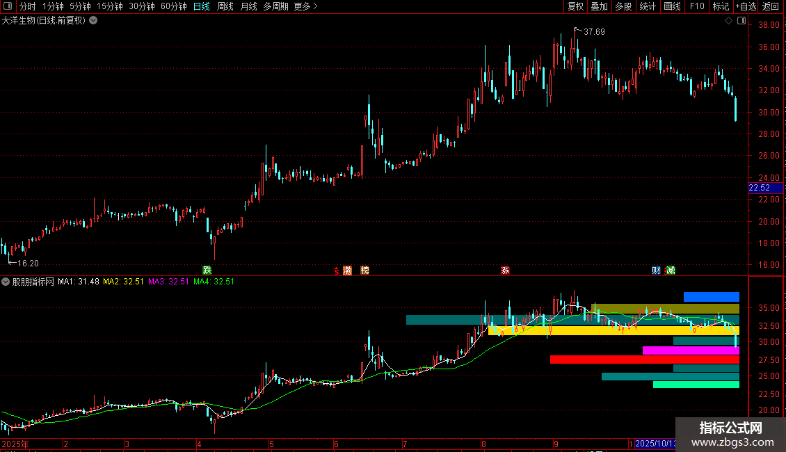 4. 同时叠加绘制了5日、20日(重复三次)的简单移动平均线(MA),用于辅助判断趋势。