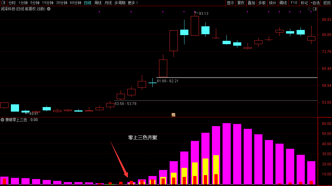 2.通常我们从第一根三色齐聚的柱体位置上车,选股信号就是零上第一根三色柱。
