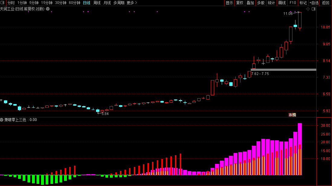 1.整个副图上只有四种颜色的柱体,我们只要在0轴上方同时聚齐粉黄红三种颜色的柱体就行。
