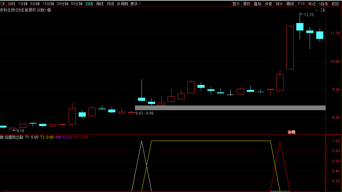通达信【倍量跳空缺口不补】副图/选股指标后市走势猛如虎源码