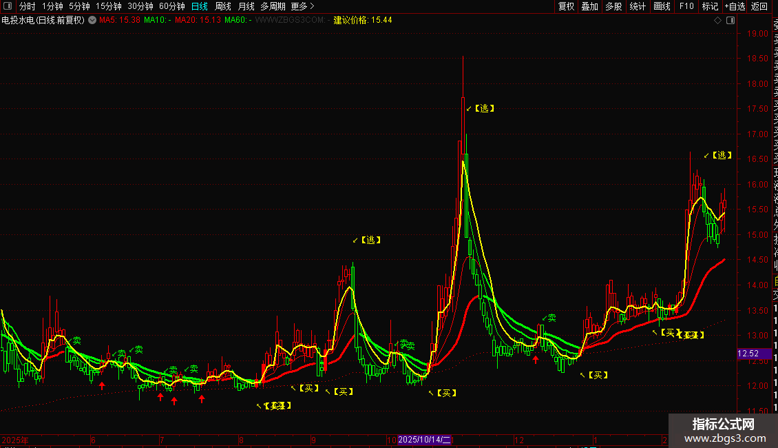 指标是一个综合型趋势跟踪系统,核心功能是通过多周期均线判断价格方向,并动态计算支撑与压力区间。操作策略上,当短期均线上穿长期均线且价格位于支撑区上方时,视为买入或加仓信号;反之,当均线下穿且价格触及压力区时,执行卖出或逃顶操作。指标还通过红绿柱状图直观展示多空力量转换,辅助投资者在趋势确立时进场,在拐点出现时离场。