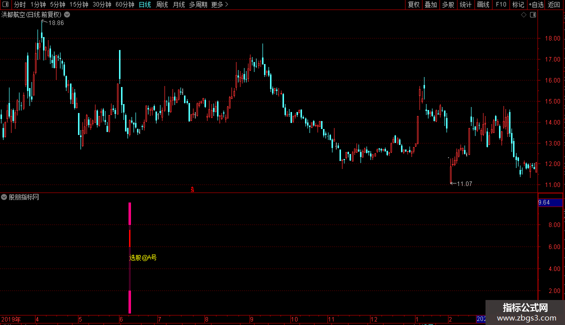 当所有条件满足时,会在副图区域绘制一组洋红色的柱状线和一个黄色的“选股@A号”文字标签,用以提示该买入信号。