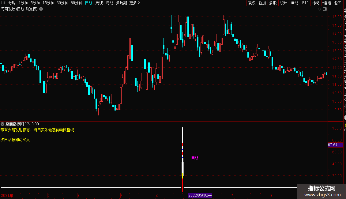 DRAWTEXT_FIX(1,0.00,0.00,0,'带有火箭发射标志,当日实体最高价画试盘线'),COLORYELLOW;